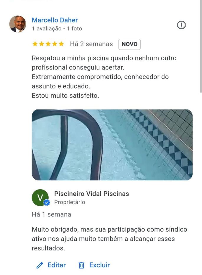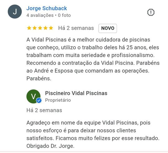 A VIDAL PISCINAS em 2010, devido a grande quantidade de seviços, se viu na necessidade de se transformar em uma empresa, pois desde 1988 atendia como autônomo, com o objetivo de ser uma empresa que faça serviços rápidos e de qualidade, sem muita burocracia como costumamos observar em outras empresas. Trouxemos um novo conceito para o mercado de piscinas, utilizando a praticidade, honestidade e solidariedade como valores. Isso tudo porque nosso compromisso é proporcionar ao consumidor a melhor experiência quando o assunto é limpeza e manutenção de piscinas. Oferecemos diversos serviços: conserto e instalação de bombas e filtros de piscinas, limpeza e tratamento de piscinas, venda de produtos e equipamentos de piscinas e muito mais! Tudo a apenas um telefonema de distância.